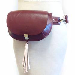 Кожаная сумка-пояс с декоративной подвеской-бахромой бордового цвета