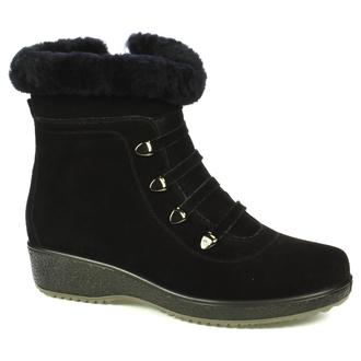Повседневные ботинки на устойчивом каблуке. Верх и подкладка из натуральных материалов. Нескользящая подошва. За счет всех этих качеств модель очень комфортна в носке. . Зимний сезон. Фасон - Повседневные ботинки. Застёжка - замок. Каблук - танкетка низкая. Материал - натуральная замша. Материал подкладки - натуральная цигейка. Высота каблука - 4 см. Толщина подошвы - 2 см. Высота обуви с каблуком - 19 см.