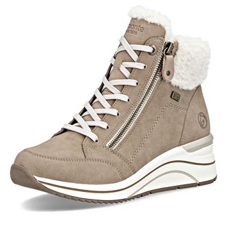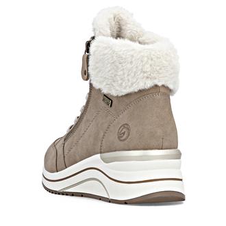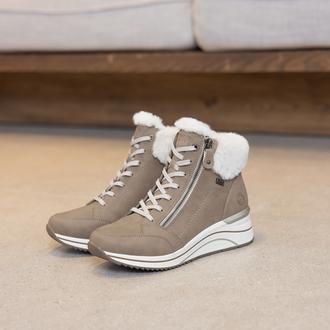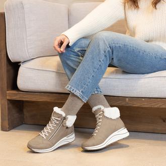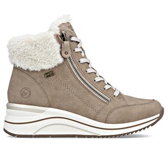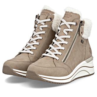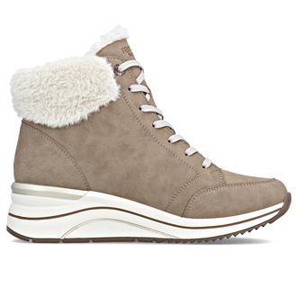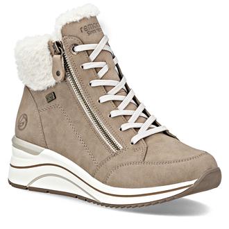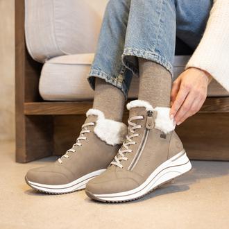 Повседневные ботинки Remonte арт. D0T77-20. Зимний сезон. Фасон - Повседневные ботинки. Застёжка - шнуровка,две молнии. Каблук - спортивная подошва. Материал - натуральная кожа,текстиль. Материал подкладки - натуральная овечья шерсть,мембрана. Вид стельки - съёмная шерстяная стелька. Высота каблука - 5,5 см. Толщина подошвы - 3 см. Высота обуви с каблуком - 18 см.