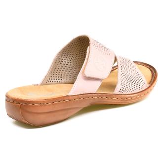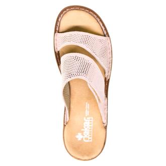 Шлёпанцы Rieker арт. 60812-31. Летний сезон. Фасон - Шлёпанцы. Застёжка - липучка. Каблук - танкетка низкая. Материал - натуральная кожа. Материал подкладки - искусственная кожа. Вид стельки - текстильная стелька. Высота каблука - 3,5 см. Толщина подошвы - 1,5 см.