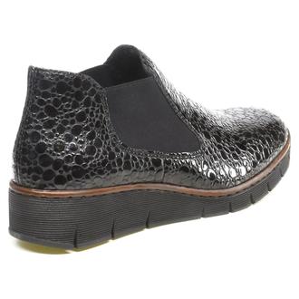Повседневные ботинки Rieker арт. 53790-45. Осень. Фасон - Повседневные ботинки. Каблук - танкетка низкая. Материал - искусственная лаковая кожа. Материал подкладки - байка. Вид стельки - шерстяная стелька. Высота каблука - 3,5 см. Толщина подошвы - 1,5 см. Высота обуви с каблуком - 12 см.