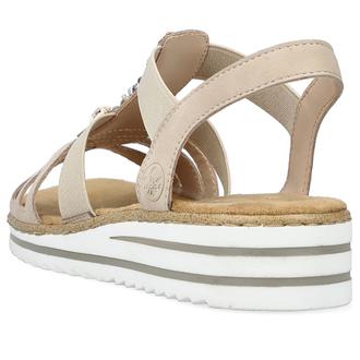 Сандалии Rieker арт. V0649-62. Летний сезон. Фасон - Сандалии. Каблук - танкетка низкая. Материал - экокожа. Материал подкладки - искусственная кожа. Вид стельки - текстильная стелька. Высота каблука - 3,5 см. Толщина подошвы - 1,5 см.
